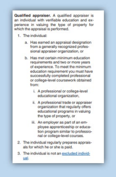 Additionally, 31 U.S. Code §330 Practice before the Department regulates the practice of representatives of persons before the Department of the Treasury, which includes appraisers. They must demonstrate: