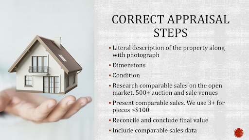Mayur then remits an appraisal quoted value range to the client within 24-48 hours of receiving the information. This range is based solely upon examination of closed sales and firm offers of sale of similar materials in the open and relevant market, which is the secondary retail and auction market. The estimate is not based upon square footage calculations or using construction estimating software such as R.S. Means or Marshall & Swift.